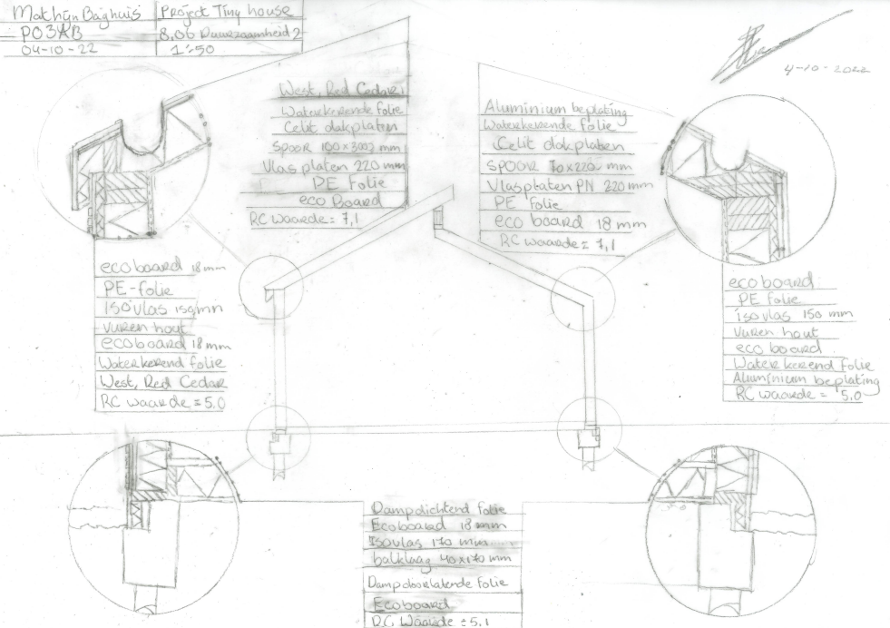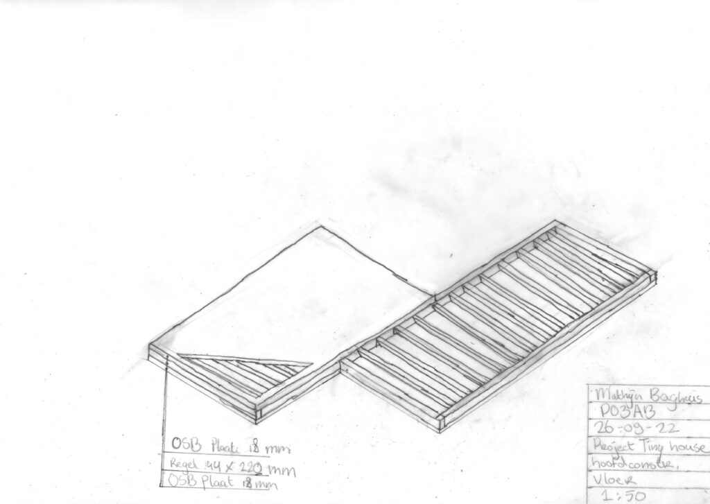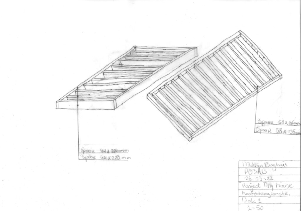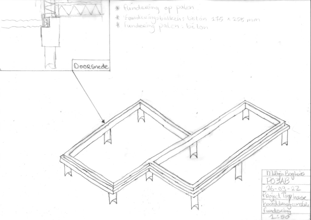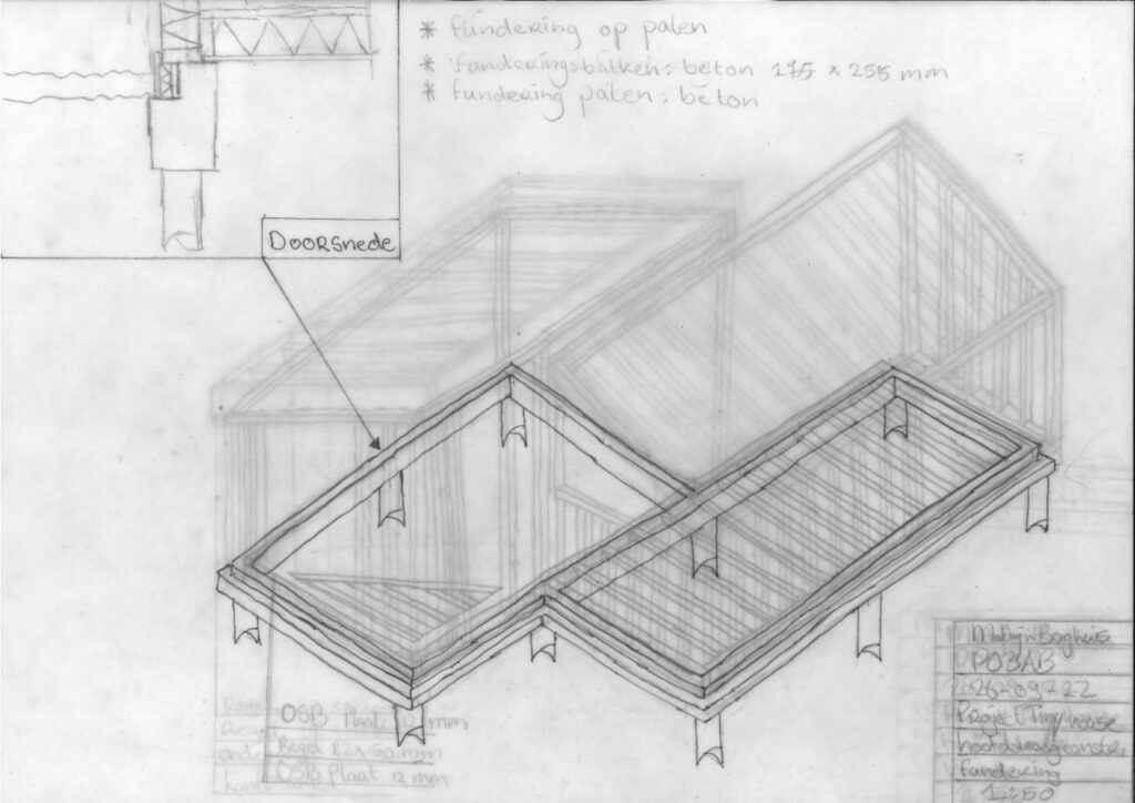 Bij de hoofddraagconstructie ben ik eerst bodemonderzoek gaan doen, hieruit bleek dat de bodem van het gebied grotendeels kleigrond was. Hierdoor moest ik de tiny house op een palen fundering plaatsen. Het skelet van het tiny house word gemaakt van vuren hout.