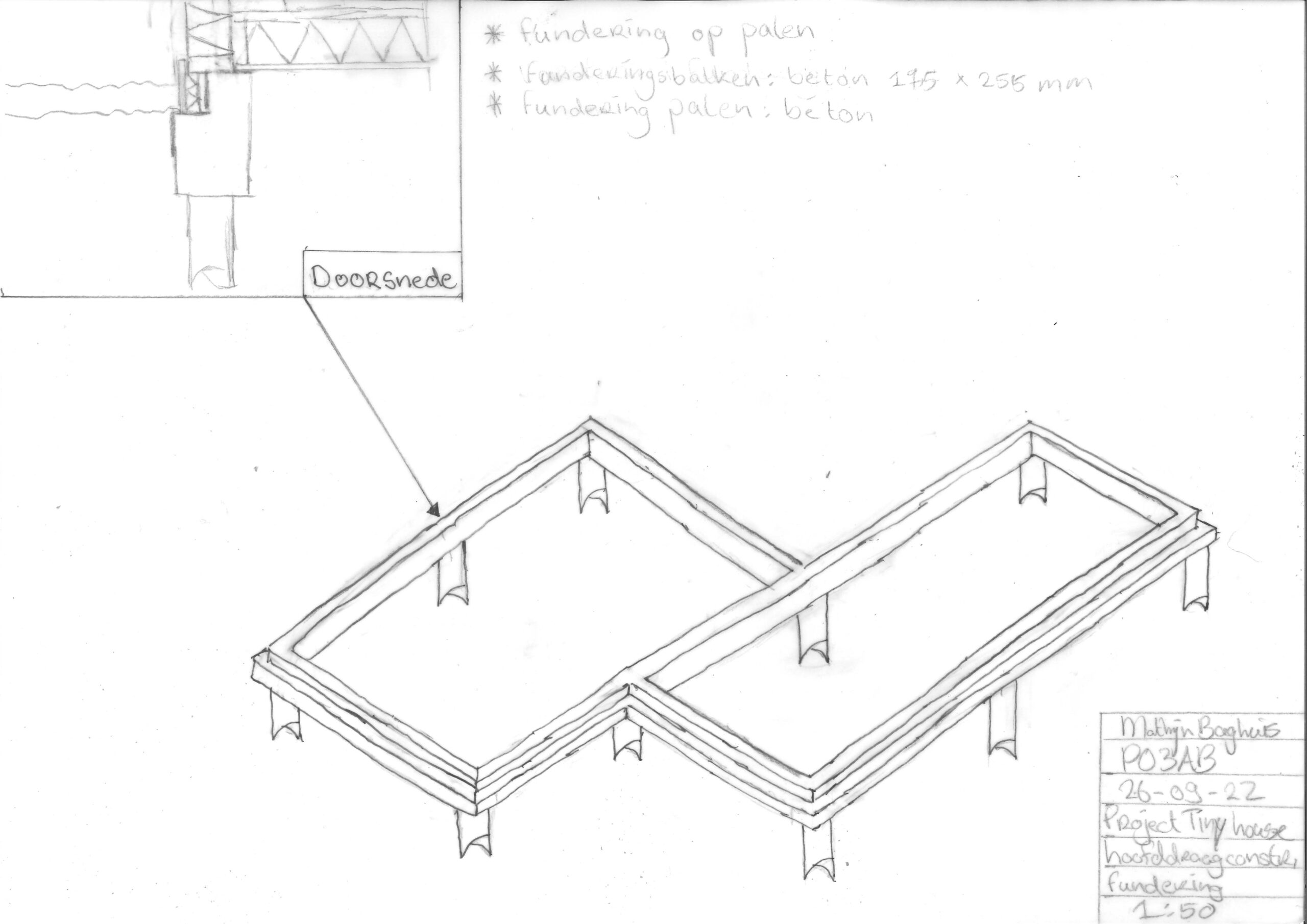 Bij de hoofddraagconstructie ben ik eerst bodemonderzoek gaan doen, hieruit bleek dat de bodem van het gebied grotendeels kleigrond was. Hierdoor moest ik de tiny house op een palen fundering plaatsen. Het skelet van het tiny house word gemaakt van vuren hout.
