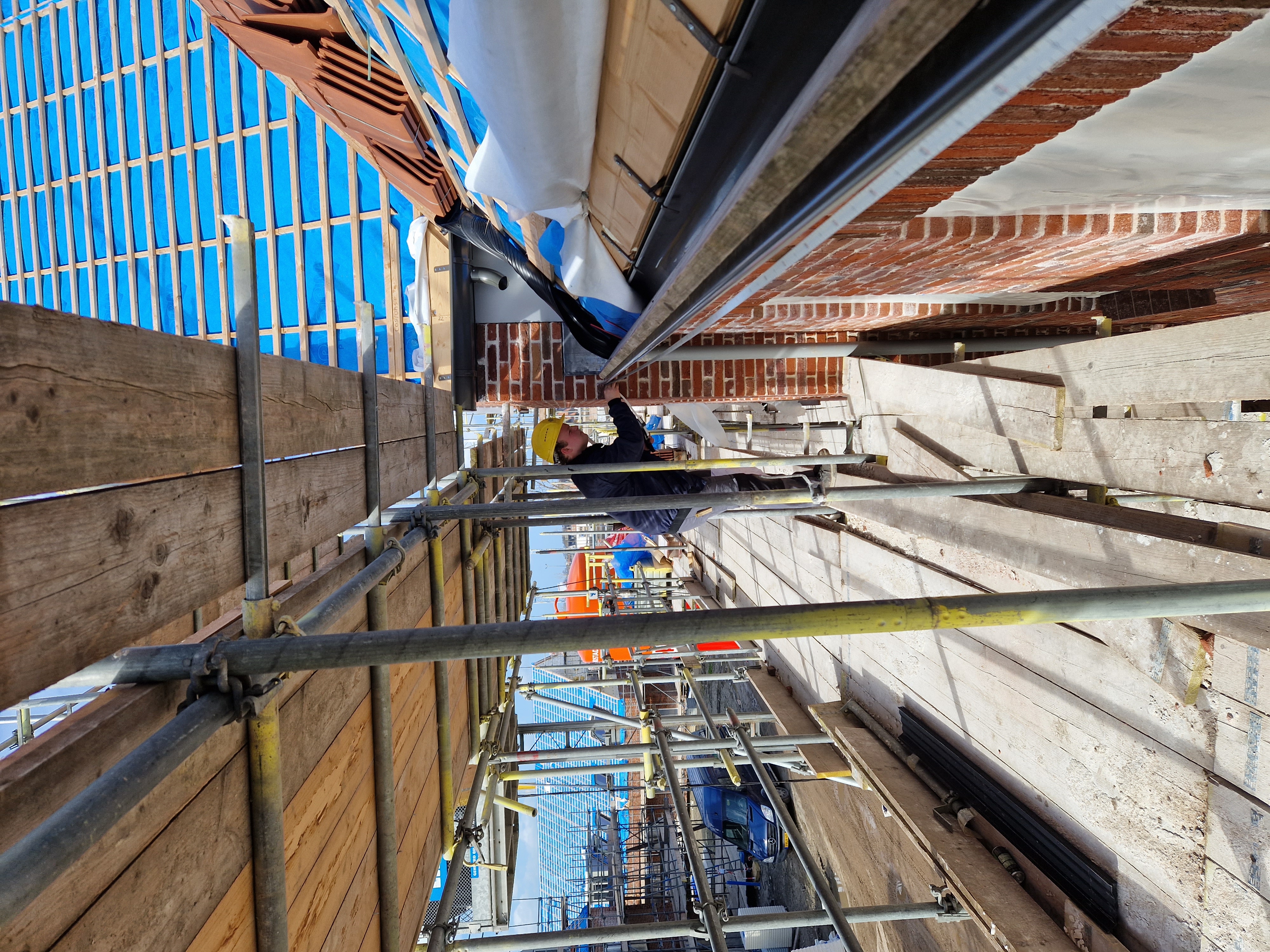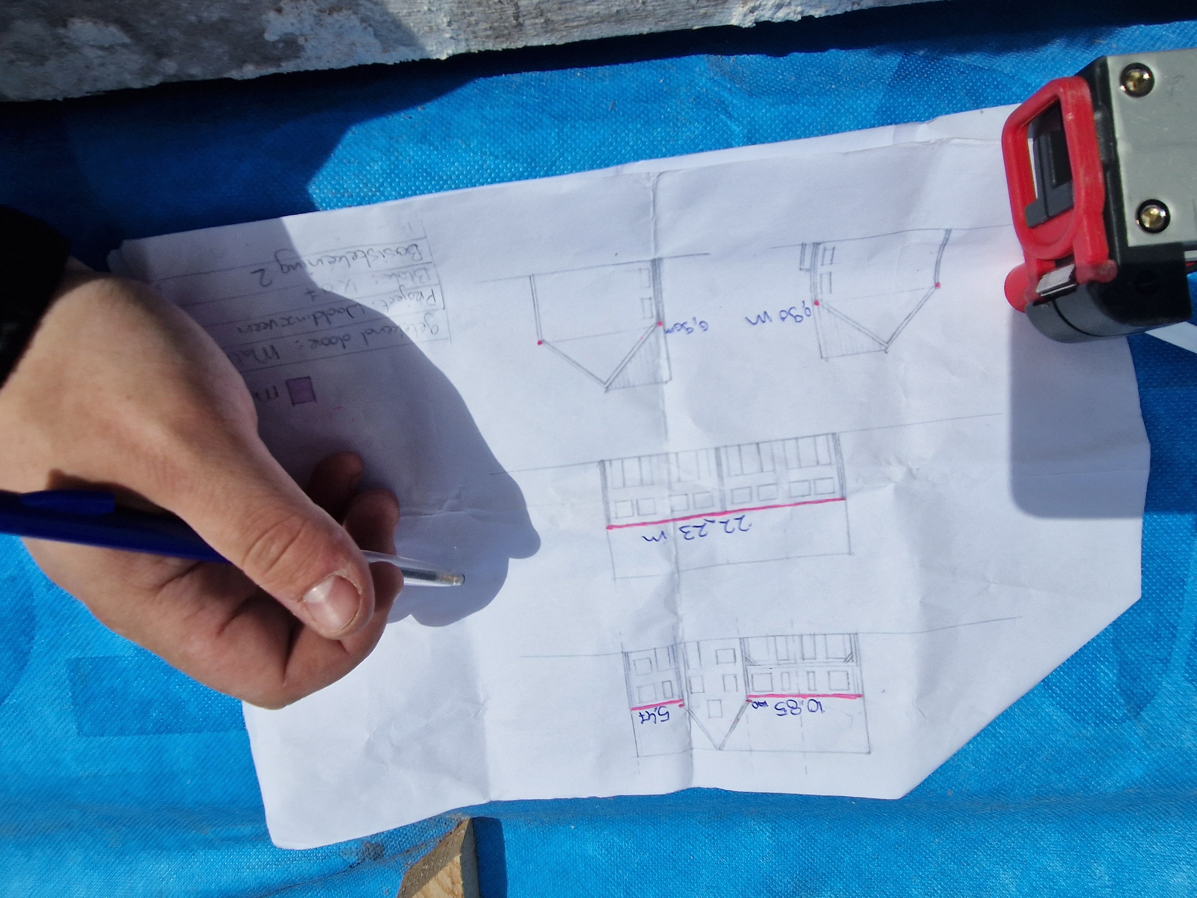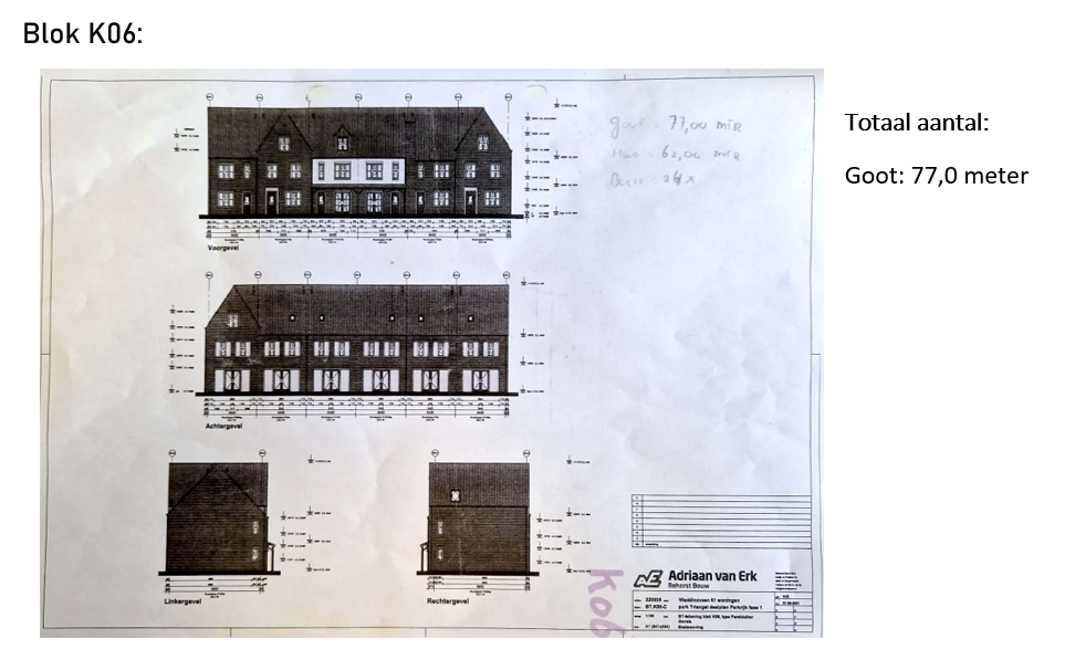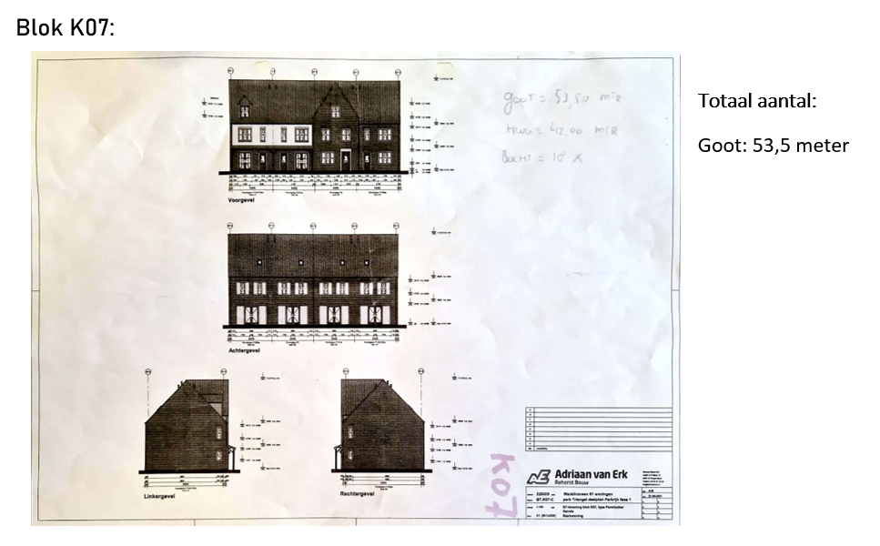In week 6 ben ik een dag mee geweest om de woningblokken op te meten. In week 5 heb ik meegeholpen met het plaatsen van deze goten. De steigers stonden nog opgesteld omdat het dak nog gedekt moest worden. Hierdoor kon ik gemakkelijk de goten opmeten. Van ieder blok heb ik op de basistekening aangegeven wat mijn waargenomen afmetingen zijn.