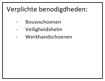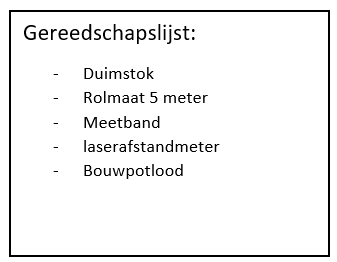In de gereedschapslijst heb ik alles gezet wat ik nodig heb om het meetwerk uit te kunnen voeren. Ik neem verschillende soorten meetapparatuur mee omdat er grote en kleine meetwerken gedaan moeten worden. Daarnaast is het niet helemaal zeker of het steigerwerk er nog staat, daarom neem ik de laserafstandmeter mee.