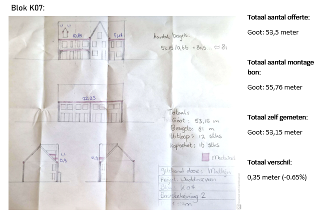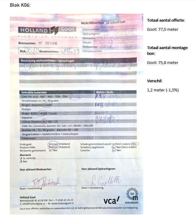 Vanuit de controle blijkt dat de afmetingen in beide blokken afwijken van zowel de montage bon als de zelf gemeten variant. Deze afwijking is dusdanig klein (-2,95%) dat het niet opnieuw word geoffreerd en dus de hoeveelheid op de offerte word aangehouden op de factuur. De afwijking zit namelijk nog binnen de 10% die Holland Goot aan houd.