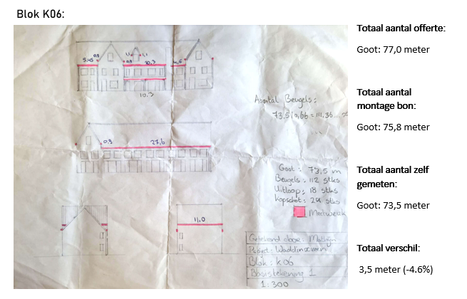In deze opdracht heb ik twee woningblokken opgemeten waar dakgoten gemonteerd aan zijn. Ik heb bij iedere woningblok 3 meetmomenten opgenomen, de maatvoering op de offerte, de montage bon en mijn eigen metingen.